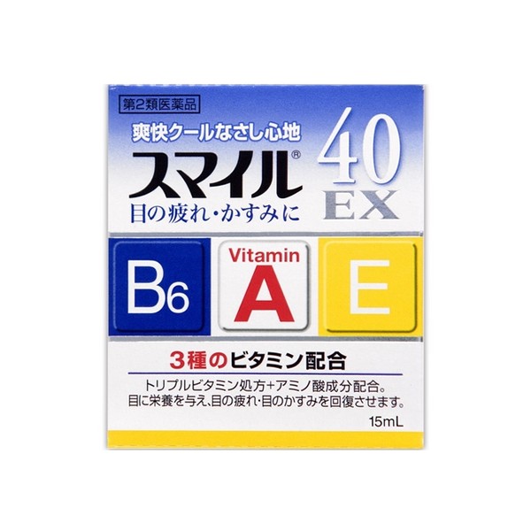 효과 | 트리플 비타민 처방(기준 내 최대 수 배합※) 스마일 40EX눈에 대한 주요 효능 피로 가려움 뿌염 충혈 ※일반용 안과용 약 제조 판매 승인 기준 ● 효능, 효과 눈의 피로, 눈의 카스미(눈곱이 많은 때 등), 결막 충혈, 눈 가려움증, 안검염 (눈 타다레)눈병 예방(수영 후 먼지나 땀이 눈에 들어갔을 때 등) 자외선 기타 광선에 의한 안염(눈째 등)하드 콘택트 렌즈를 착용하고 있을 때의 불쾌감