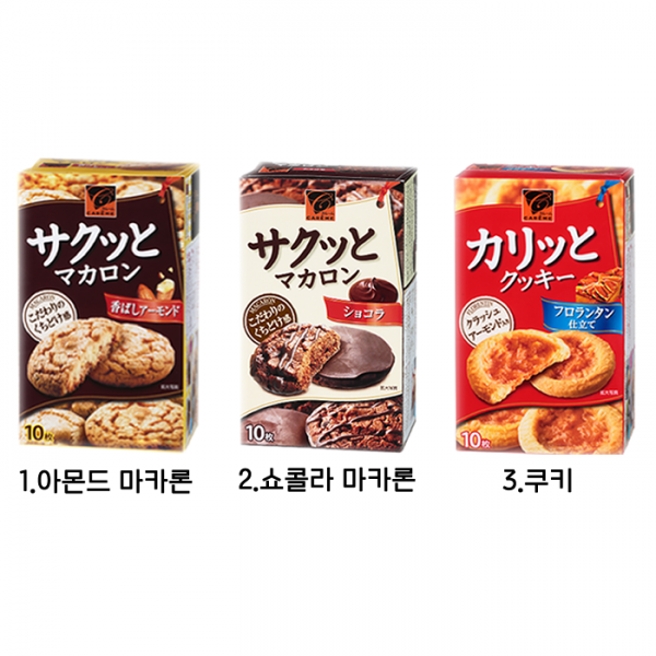 원재료 | 1. 아몬드 마카론 원자재:설탕, 밀가루, 계란 흰자, 아몬드, 쇼트닝, 마가린, 아몬드 페이스트, 소금, 향신료, 트레 할로 오스, 가공 가루, 팽창제, 유화제, 향료, 마리고루도 색소( 원자재 일부에 달걀, 우유 성분 참깨 콩을 포함)