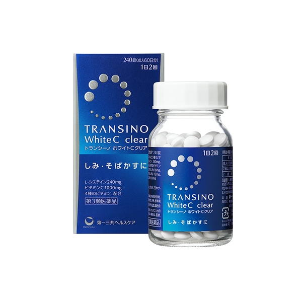 L - 시스테인과 비타민 C가 멜라민에 작용해서 기미, 주근깨를 완화해주는 효과가 있습니다.트란시노 화이트에 포함된 비타민 C는 화상 염증에 의한 색소 침착, 육체피로, 임신, 수유, 병중 병후의 체력 회복에도 효과가 있습니다.비타민 C1000mg, L-시스테인 240mg 배합량의 자신감.